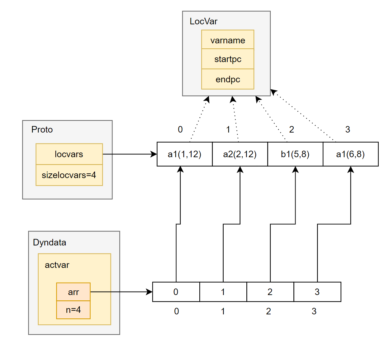 函数的固定参数,可变参数,以及函数体里 local 定义的变量都属于函数局部变量。我们首先简单来了解下 local 定义的局部变量实现,从上面 Proto 结构体中,可以看到,局部变量记录用到的字段有:locvars,sizelocvars,locvars 存储的是一个 LocVar 的数组,大小为 sizelocvars,主要作用是在调试时,输出堆栈信息。LocVar 对应的结构体如下: