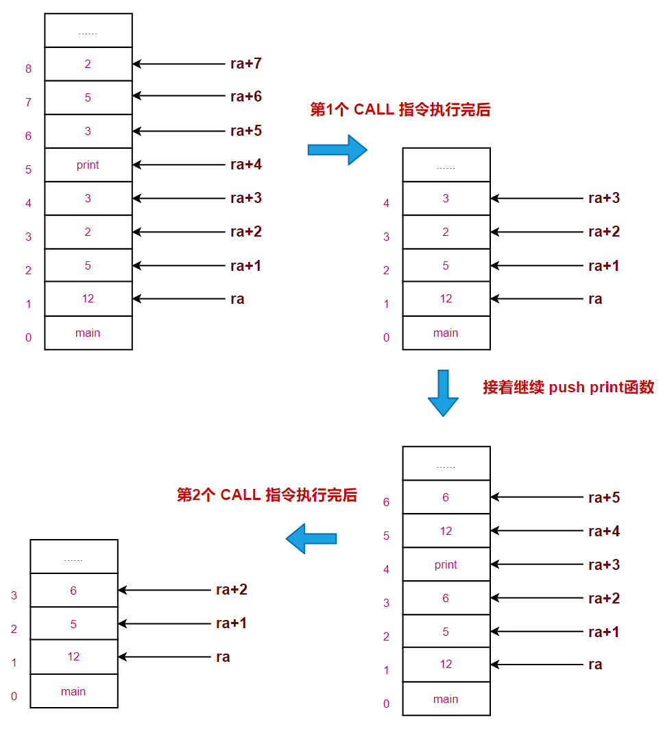对 两个 print 函数打印前后,栈的数据分析如下图: