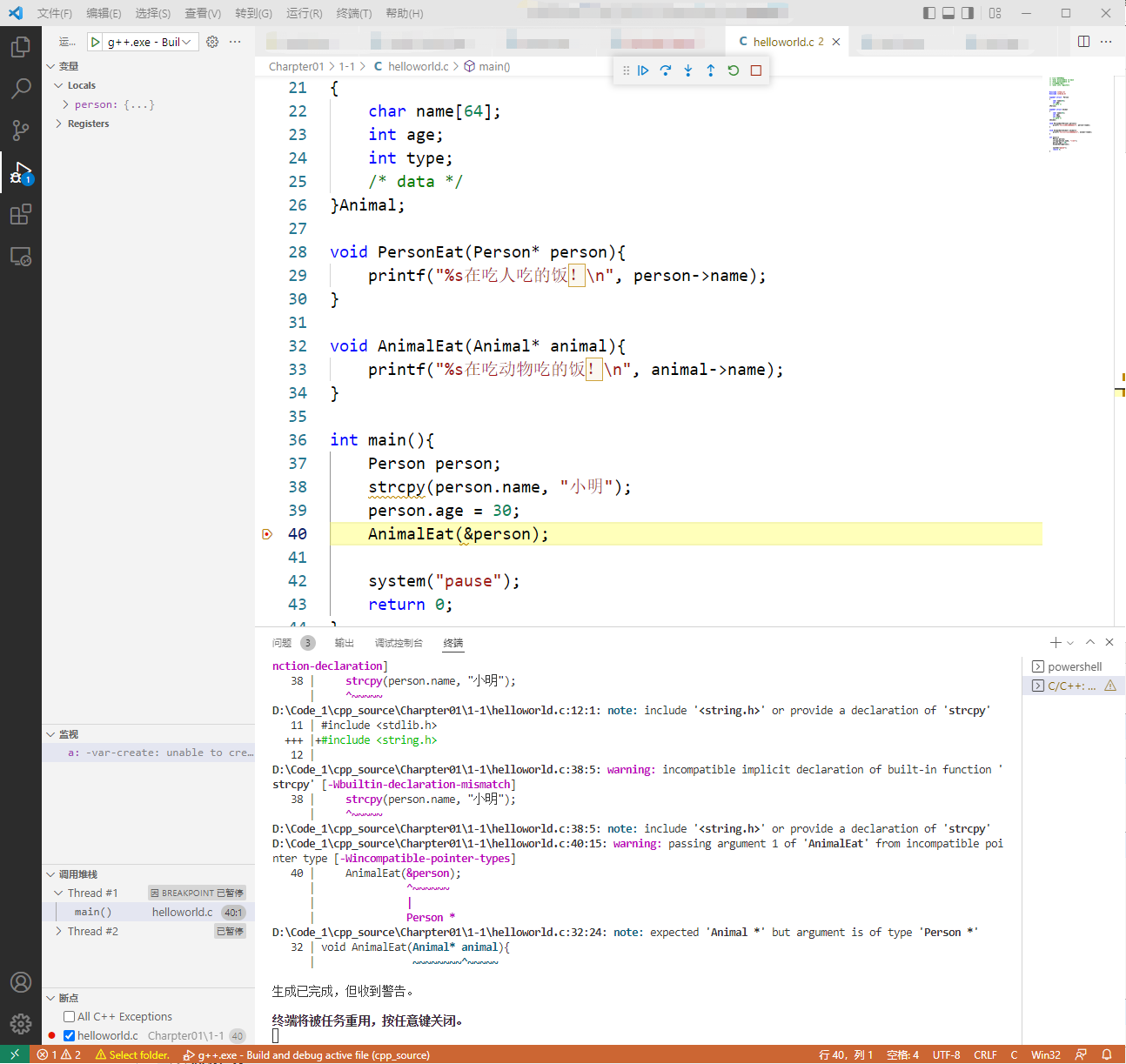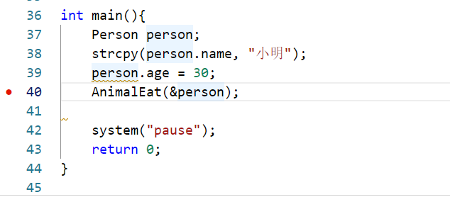 #include <stdio.h> #include <stdlib.h> typedef struct Person { char name[64]; int age; /* data */ }Person; typedef struct Animal { char name[64]; int age; int type; /* data */ }Animal; void PersonEat(Person* person){ printf("%s在吃人吃的饭!\n", person->name); } void AnimalEat(Animal* animal){ printf("%s在吃动物吃的饭!\n", animal->name); } int main(){ Person person; strcpy(person.name, "小明"); person.age = 30; AnimalEat(&person); system("pause"); return 0; }