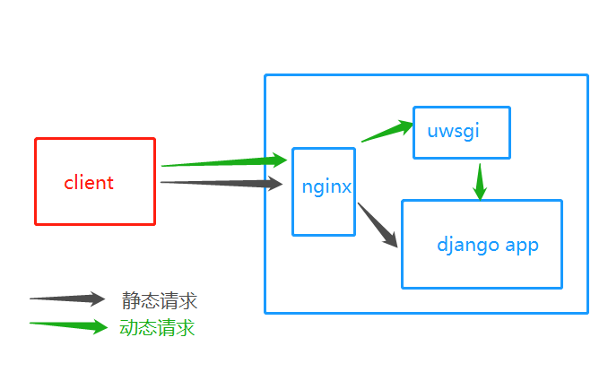 由于uwsgi处理静态请求的能力较差,所以通常使用nginx server处理静态请求,uwsgi处理动态请求,实现动静分离。
