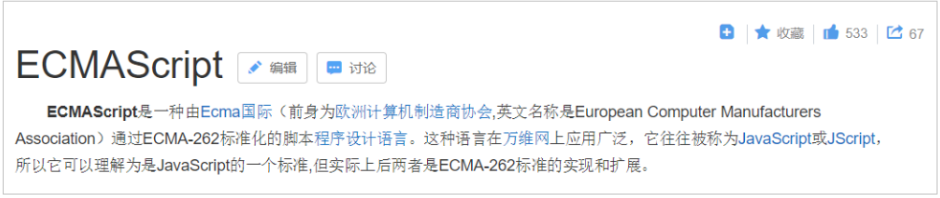ECMAScript标准不定义HTML或CSS的相关功能,也不定义类似DOM(文档对象模型)的[Web API],这些都在独立的标准中进行定义。ECMAScript涵盖了各种环境中JS的使用场景,无论是浏览器环境还是类似[node.js]的非浏览器环境。