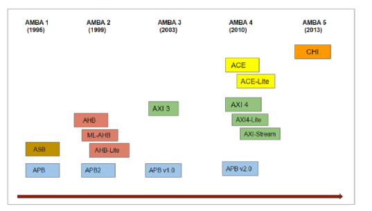 随随着越来越多的IP集成到SOC设计中,读写共享的AHB、APB总线已经无法满足互联需求了。2003年,AMBA3.0引入了点对点连接协议——AXI(高级可扩展接口)。此外在2010年,又推出了一个增强版——AXI4。下图说明了协议的演变以及行业中的SOC设计趋势。