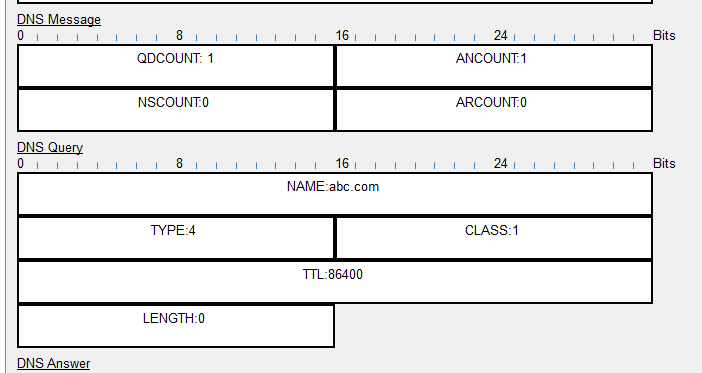 PC端向服务器发送请求报文,请求abc.com的IP地址,TTL记录了报文的生存时间为86400,TYPE为表示查询类型,CLASS表示查询类。DNS Query表示DNS类请求报文。