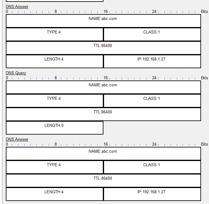 服务器向PC发送相应报文,指出域名为abc.com的IP地址为192.168.1.27,根据图中TTL数据可知,该报文过期时间为86400。