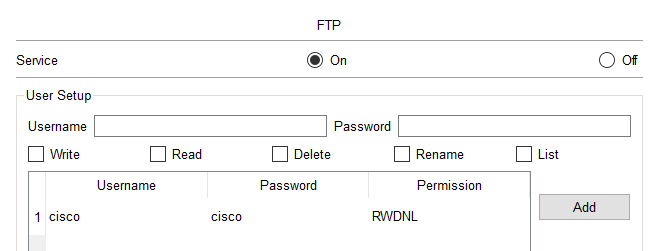 PC端与服务器端的IP同3.1实验中的IP相同,打开服务器端的FTP,使用默认的用户名:cisco与默认的密码:cisco