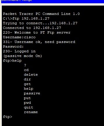 打开PC端的Command Prompt,输入ftp 192.168.1.27,使用默认的用户名登录,并输入help查看系统指令。