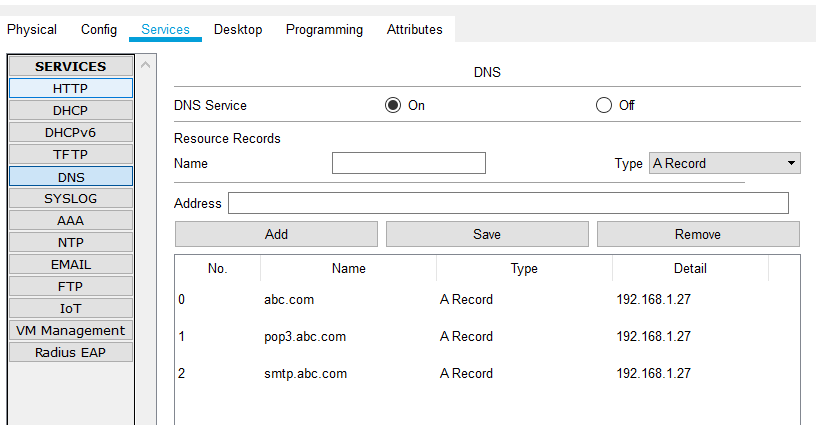 使用Packet Tracer,正确配置网络参数,抓取应用层协议的数据包并分析,协议包含DNS、FTP, DHCP, stmp, pop3。步骤包含: