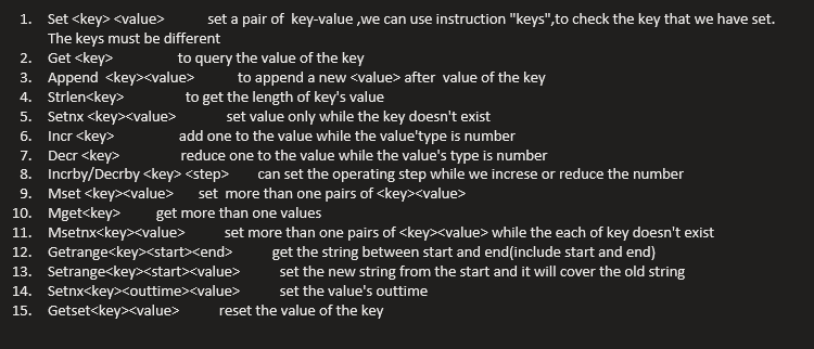 - Type of string is binary-safe, which the value of string in redis can inlcude any typical data,such as image with jpg format, serialized object and so on. The maximum capacity of string in redis is 512MB.