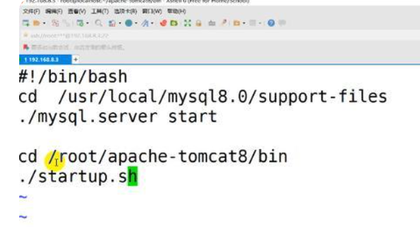 再添加一行:cd /root/apache-tomcat8/bin (一定要把路径对应清楚,tomcat服务是在哪里启动的)