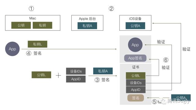 可以想到把 允许安装的设备 ID 列表 和 App对应的 AppID 等数据,都在第三步这里跟公钥L一起组成证书,再用苹果私钥 A 对这个证书签名。在最后第 5 步验证时就可以拿到设备 ID 列表,判断当前设备是否符合要求。根据数字签名的原理,只要数字签名通过验证,第 5 步这里的设备 IDs / AppID / 公钥 L 就都是经过苹果认证的,无法被修改,苹果就可以限制可安装的设备和 APP,避免滥用。