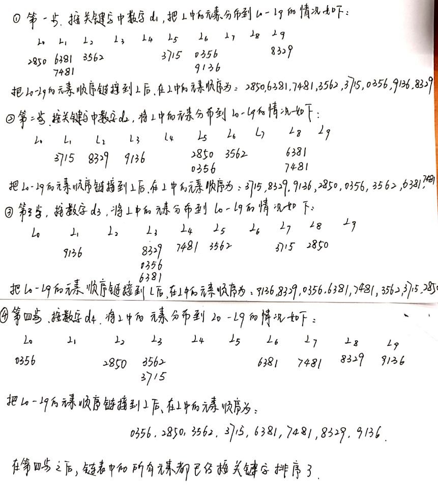 习题P84 T14:初始链表的内容为:3562,6381,0356,2850,9136,3715,8329,7481,写出用基数排序算法对他们进行排序的过程。
