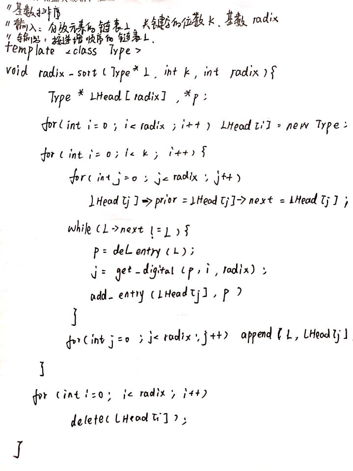 // 基数排序 输入:存放元素的链表 L,关键字的数字位数 k 输出:按递增顺序排序的链表 L