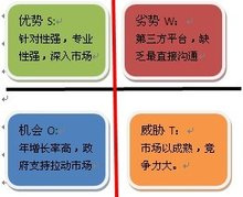 3. SWOT :S (strengths)是优势、W (weaknesses)是劣势,O (opportunities)是机会、T (threats)是威胁,是SWOT分析法中的4个要素