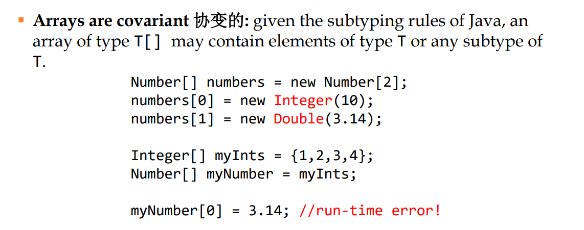 在要求 Number[]的地方完全可以传递或者赋予 Integer[]。(更正式地说,如果 Number是 Integer的超类型,那么 Number[]也是 Integer[]的超类型)。