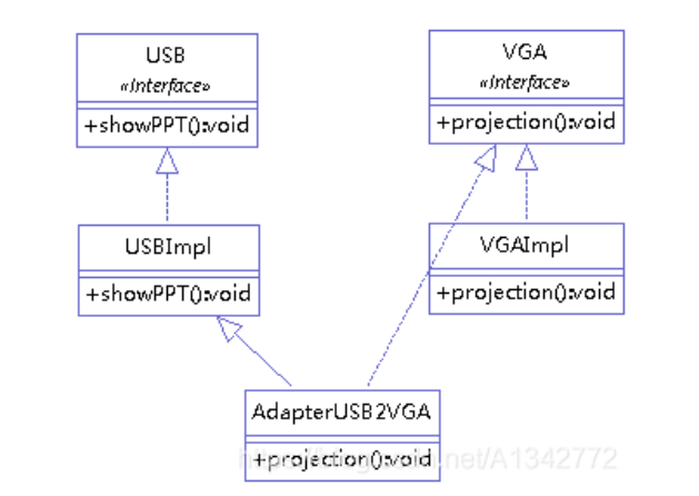 AdatperUSB2VGA 首先继承USBImpl获取USB的功能,其次,实现VGA接口,表示该类的类型为VGA。即完成了转换.