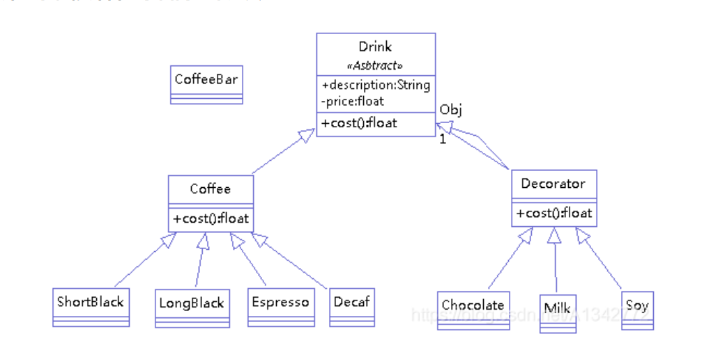 - Decorator(装饰者抽象类)维持一个指向Component实例的引用,并定义一个与Component接口一致的接口。