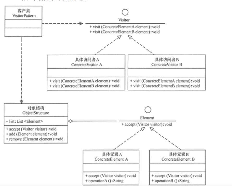 - 对象结构(Object Structure)角色:是一个包含元素角色的容器,提供让访问者对象遍历容器中的所有元素的方法,通常由 List、Set、Map 等聚合类实现。