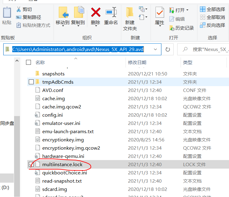 我的是进入到C:\Users\Administrator\.android\avd\Nexus_5X_API_29.avd,删除以下.lock文件就可以,不过重启模拟器之后,这个.lock文件又重新创建了。(原因未知)