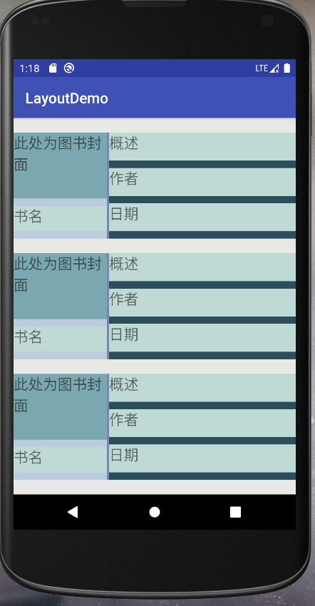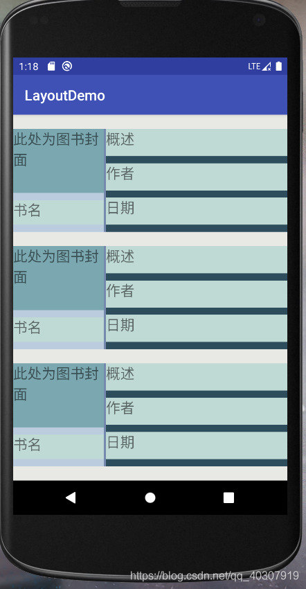 编写代码通过线性布局实现以下UI界⾯,该布局总共分为上中下三部分,每⼀个部分展示的是⼀本书的 详细信息