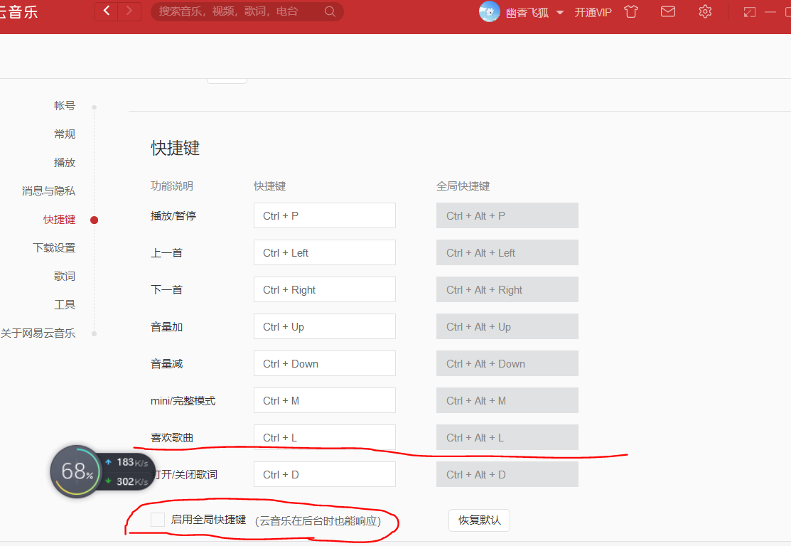 1.网易云音乐中(QQ输入法,与搜狗输入法中没有Ctrl+alt+L的快捷键)