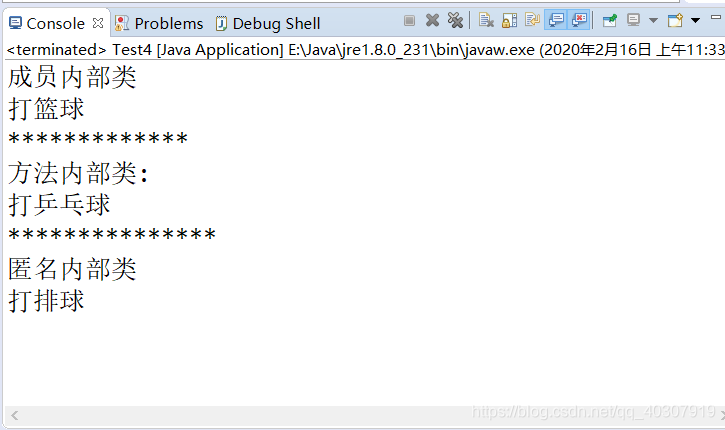 - 在BallTest中,创建成员方法info(),在方法中创建方法内部类Inner_f实现Ball接口,重写play()方法,输出三条信息,分别为"**************","方法内部类:"和"打乒乓球"