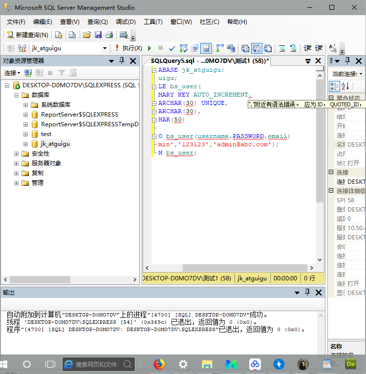 SQL SERVER中若出现','附近有语法错误。应为ID,QUOTED_ID.(需要好好学了)