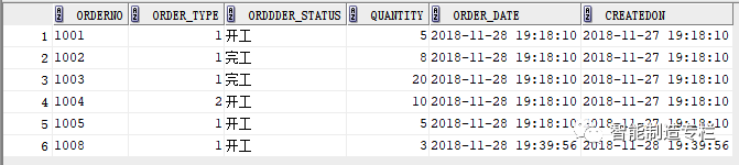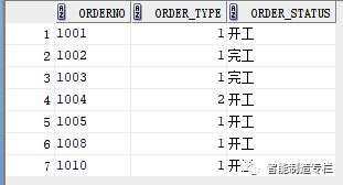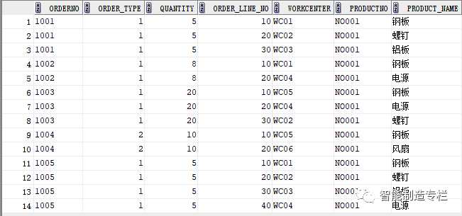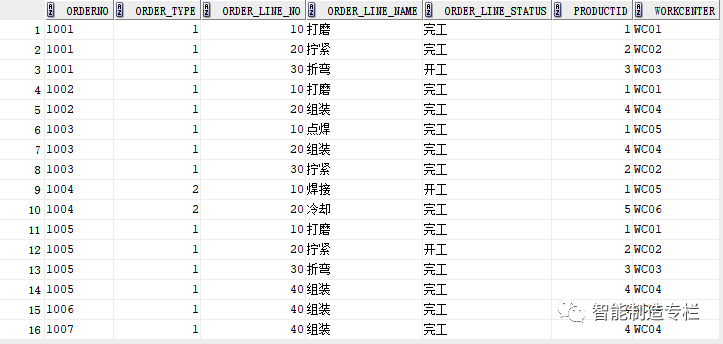 一张订单明细表,存储订单的详细信息。包含订单号、订单类型、工序号、工序名称、工序状态、物料号、工位号