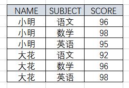 SELECT name,MAX(CASEWHEN subject='语文'THEN scoreELSE 0END) AS "语文",MAX(CASEWHEN subject='数学'THEN scoreELSE 0END) AS "数学",MAX(CASEWHEN subject='英语'THEN scoreELSE 0END) AS "英语"FROM studentGROUP BY name