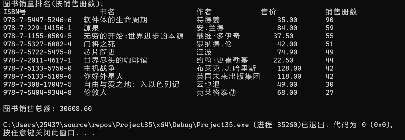 printf("ISBN号\t\t\t书名\t\t\t作者\t\t售价\t\t销售册数\n");