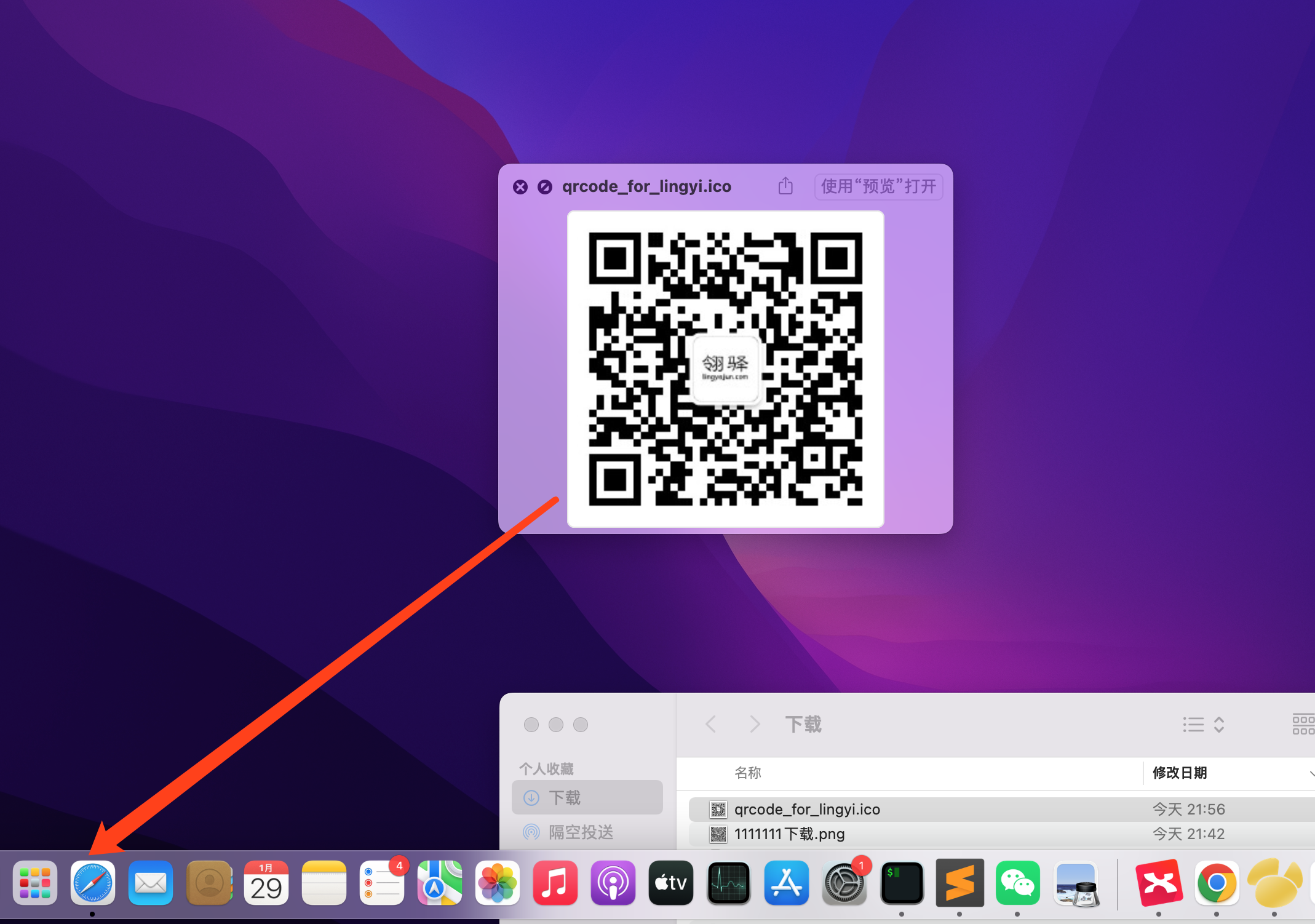 选中要识别的二维码图片,把它拖到“Safari浏览器”的图标上。