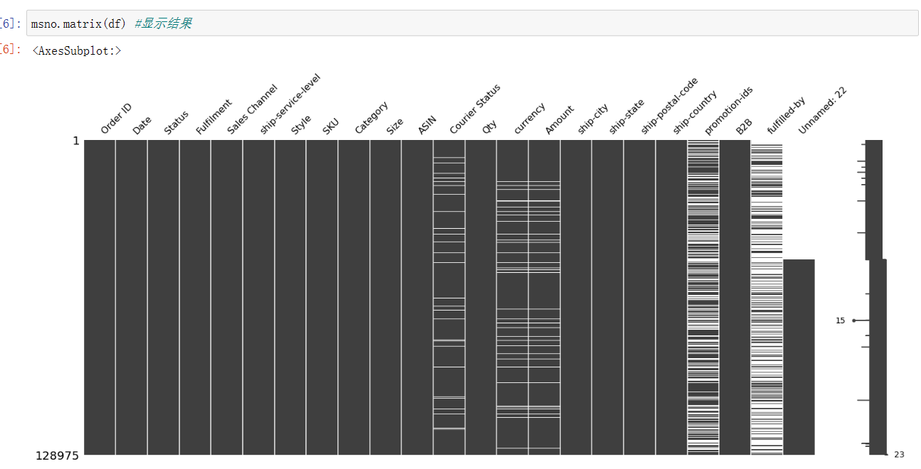 这段代码使用了Missingno库,目的是生成一个缺失值矩阵图,帮助可视化中每列的分布,更具体地说,msno.matrix(df)将每列缺失值的分布情况可视化为一个矩阵图,其中每一列代表中的一列数据,而每一行代表数据的每一行观察记录。如果一个单元格是白色的,表示该单元格对应的数据是非缺失的,否则,如果该单元格是深色的,则表示该单元格对应的数据是缺失的。