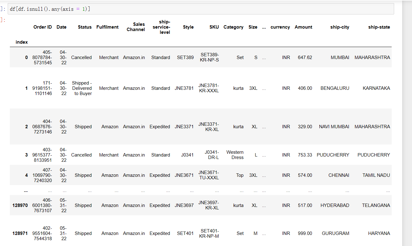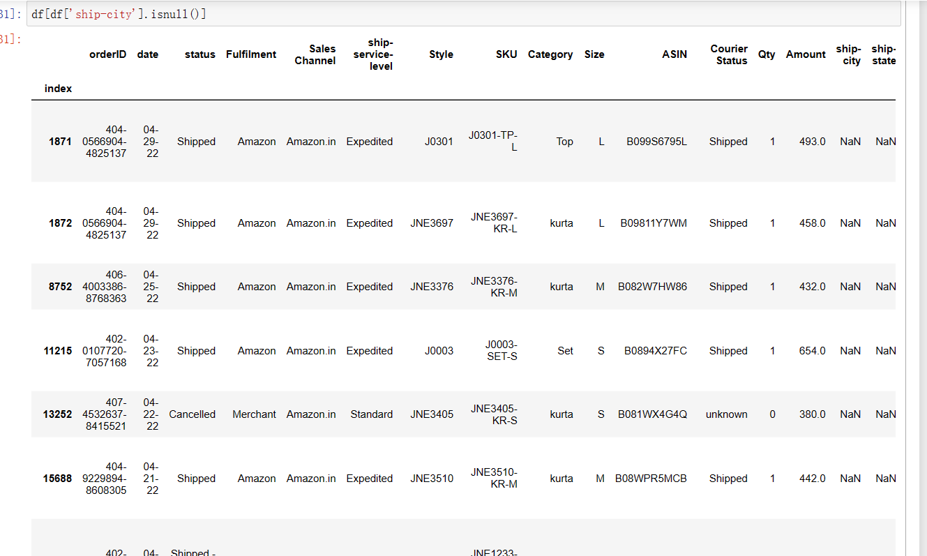 1 df[df['ship-city'].isnull()] #选取‘ship-city’为空值的行