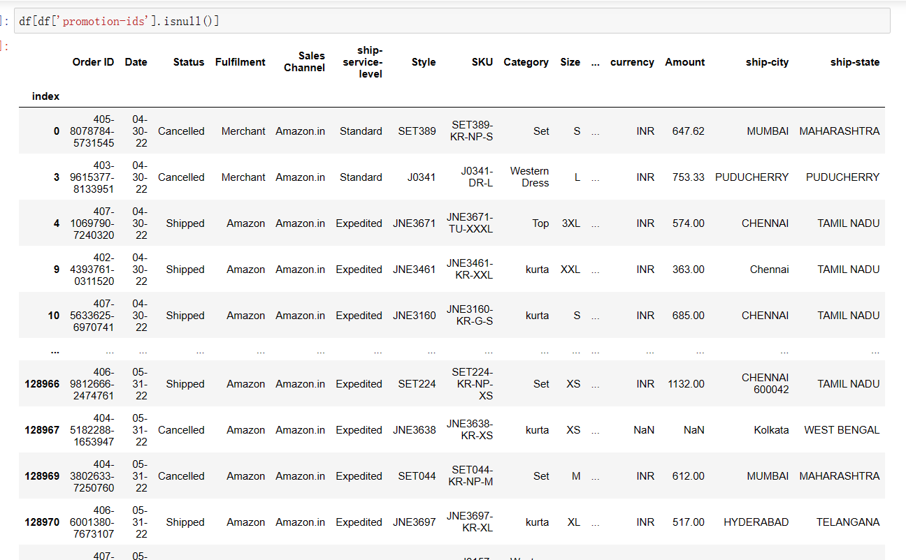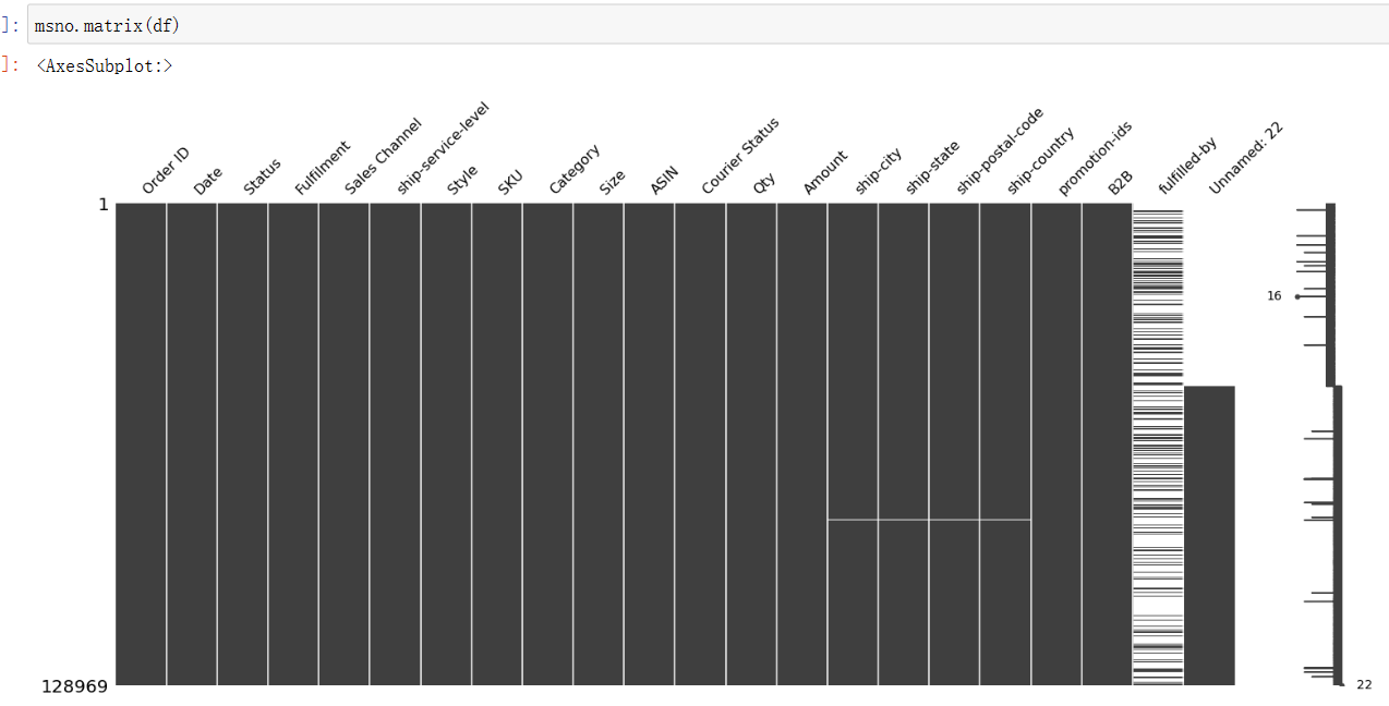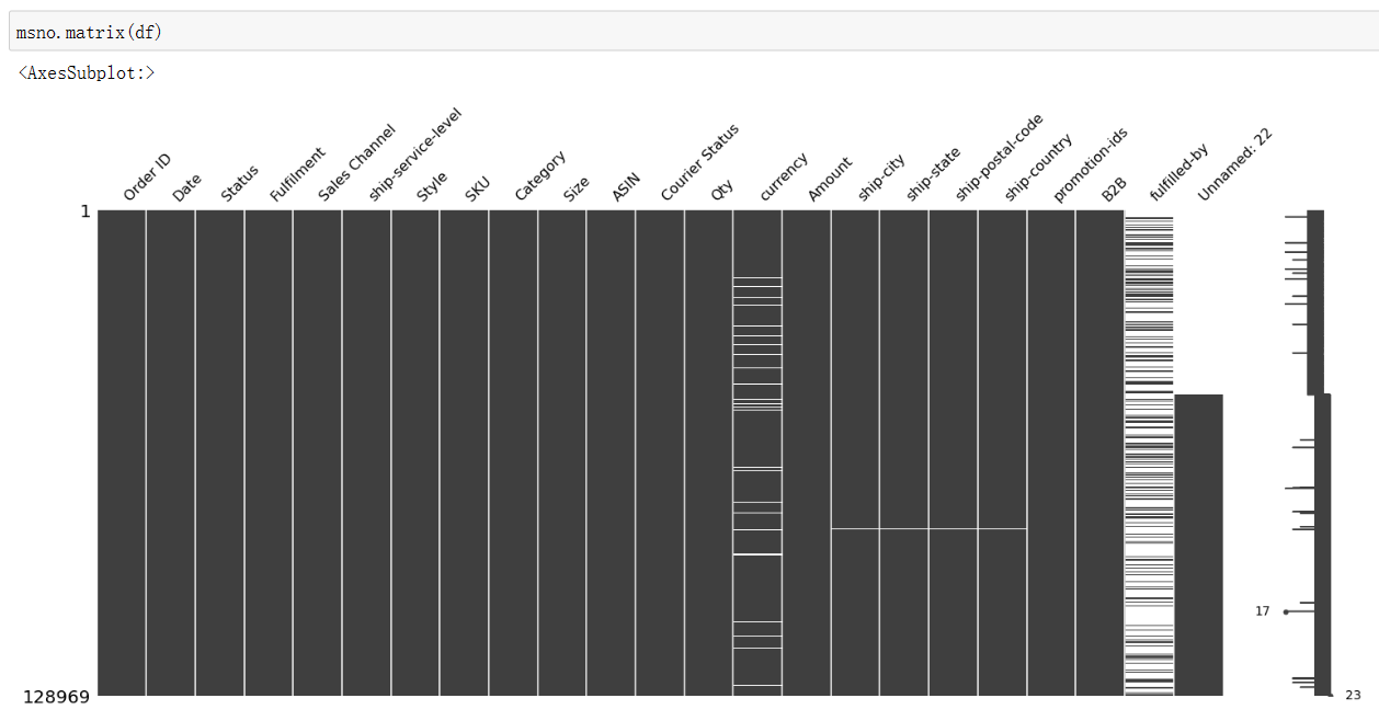 1 df['ship-city'].fillna('unknown', inplace = True) 2 df['ship-state'].fillna('unknown', inplace = True) 3 df['ship-postal-code'].fillna('unknown', inplace = True) 4 df['ship-country'].fillna('unknown', inplace = True)