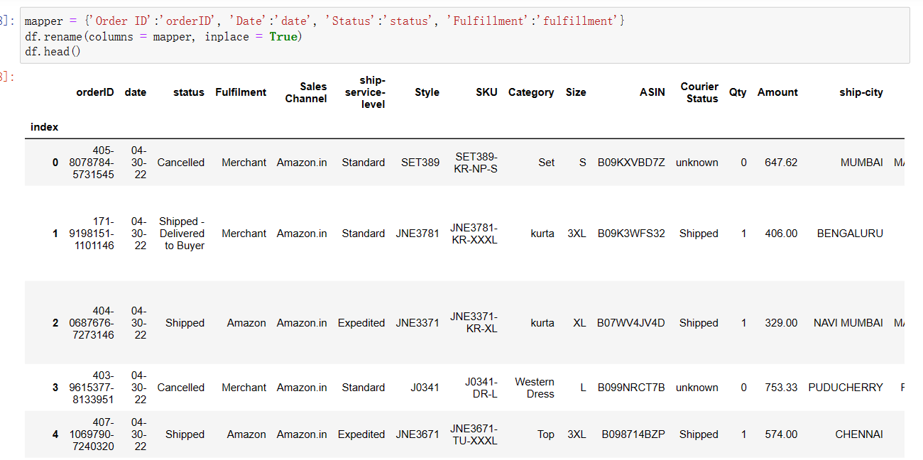 1 mapper = {'Order ID':'orderID', 'Date':'date', 'Status':'status', 'Fulfillment':'fulfillment'} #定义一个字典mapper,将四列重命名为‘orderID’、‘data’、‘status’、和‘fulfillment’ 2 df.rename(columns = mapper, inplace = True) #使用rename()方法,将列名按照定义的字典mapper进行重命名 3 df.head() #使用head()方法,返回前五行数据,显示重命名后的结果