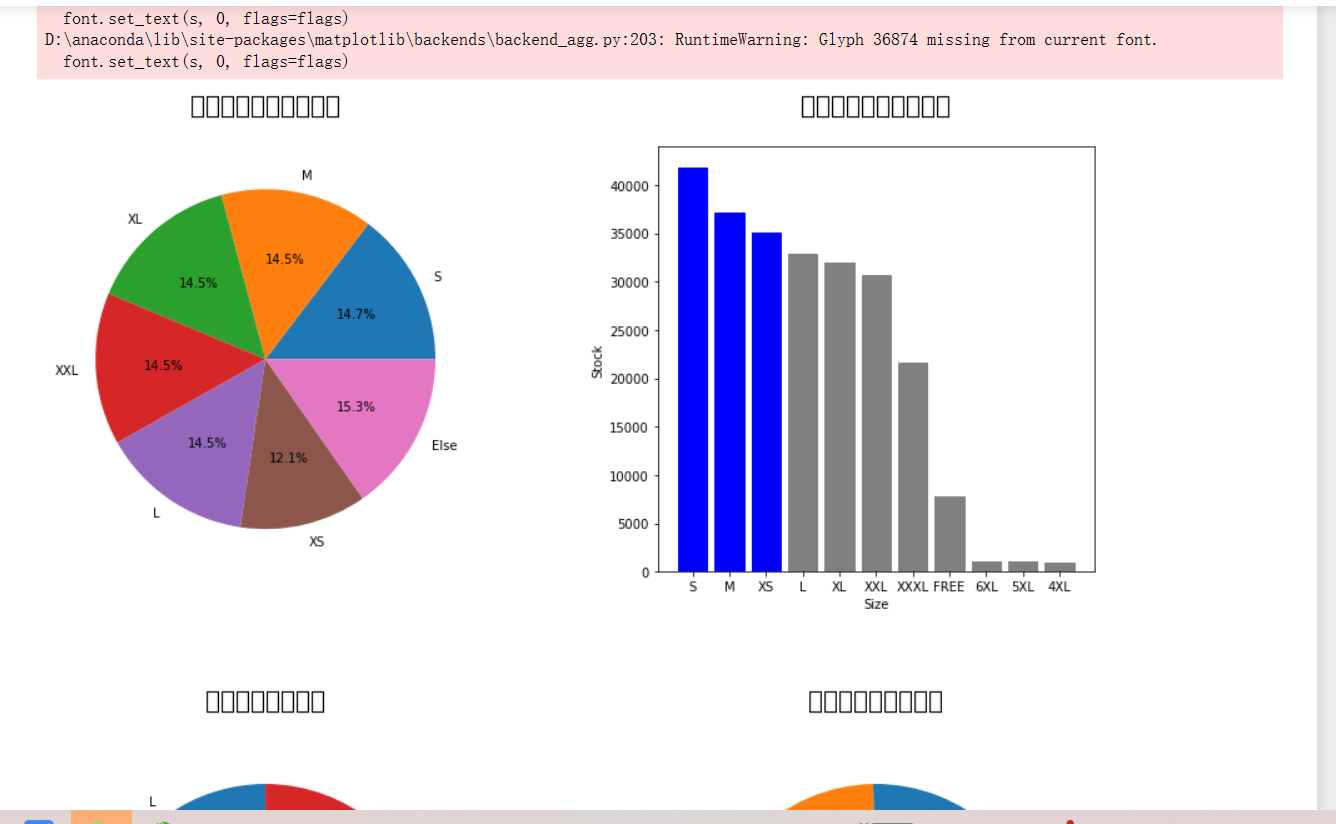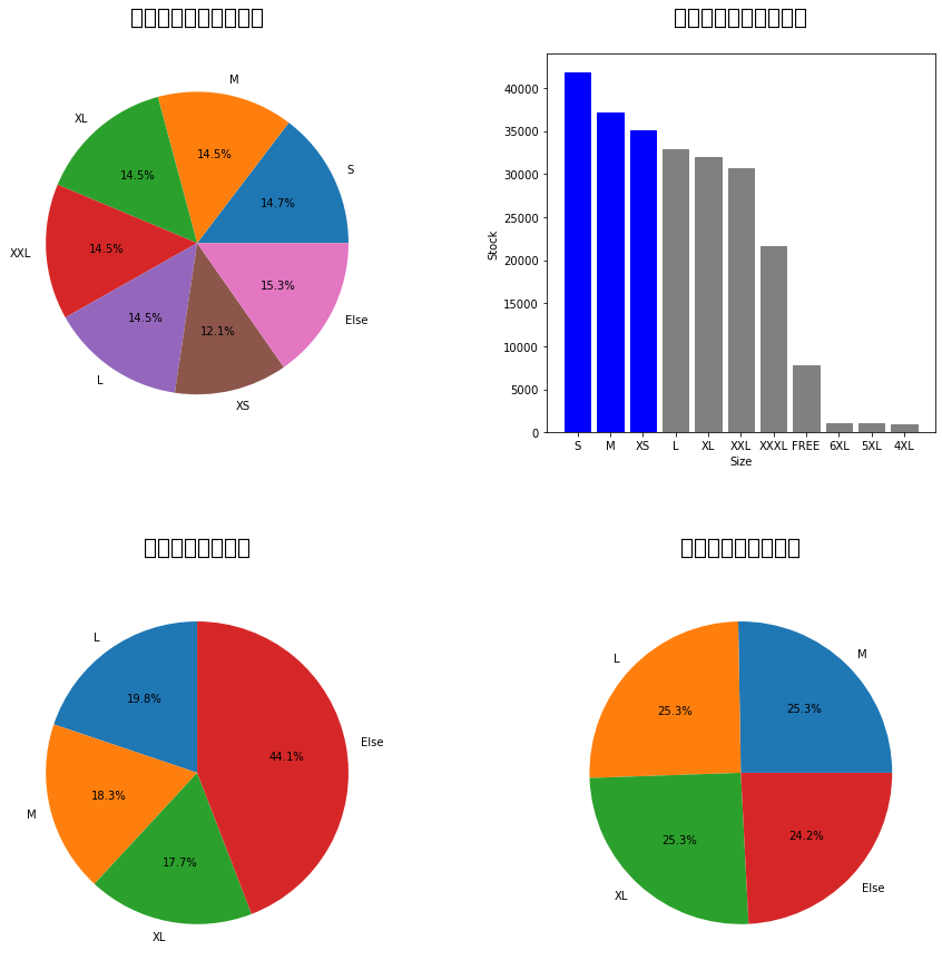 1 import pandas as pd 2 import matplotlib.pyplot as plt 3 4 # 加载数据集 5 df1 = pd.read_csv('C:\\Users\\Lenovo\\Desktop\\python\\Sale Report.csv') 6 df2 = pd.read_csv('C:\\Users\\Lenovo\\Desktop\\python\\International sale Report.csv') 7 df3 = pd.read_csv('C:\\Users\\Lenovo\\Desktop\\python\\Amazon Sale Report.csv') 8 df4 = df1 9 10 # 设置绘图网格 11 fig, axs = plt.subplots(nrows=2, ncols=2, figsize=(15, 15)) 12 13 # 绘制图表 14 sizes = df1['Size'].value_counts() 15 sizes['Else'] = sizes[['XXXL', '4XL', '5XL', '6XL', 'FREE']].sum() 16 sizes = sizes.drop(labels=['XXXL', '4XL', '5XL', '6XL', 'FREE']) 17 total_stock = sizes.sum() 18 sizes_percentage = sizes / total_stock * 100 19 axs[0, 0].pie(sizes, labels=sizes.index, autopct='%1.1f%%') 20 axs[0, 0].set_title('按规模划分的存量分布',fontsize=20, x=0.5, y=1.05, pad=10) 21 22 # 从 CSV 文件加载数据 23 data = pd.read_csv('C:\\Users\\Lenovo\\Desktop\\python\\Sale Report.csv') 24 25 # 将大小映射到聚合大小 26 size_map = {'S': 'S', 'M': 'M', 'L': 'L', 'XL': 'XL', 'XXL': '2XL', 'XXXL': '3XL', '4XL': '4XL', '5XL': '5XL', '6XL': '6XL', 'FREE': 'FREE'} 27 data['AggregatedSize'] = data['Size'].map(size_map) 28 29 # 计算每个聚合大小的库存水平总和 30 data_by_aggregated_size = data.groupby('Size').sum().reset_index() 31 32 # 按库存水平降序对数据进行排序 33 data_by_aggregated_size = data_by_aggregated_size.sort_values('Stock', ascending=False) 34 35 # 突出显示前三个聚合大小 36 data_by_aggregated_size['Highlighted'] = False 37 data_by_aggregated_size.loc[0:2, 'Highlighted'] = True 38 39 # 创建条形图 40 bars = axs[0,1].bar(data_by_aggregated_size['Size'], data_by_aggregated_size['Stock']) 41 for i in range(len(bars)): 42 if i < 3: 43 bars[i].set_color('blue') 44 else: 45 bars[i].set_color('gray') 46 axs[0,1].set(xlabel='Size', ylabel='Stock') 47 axs[0,1].set_title('按规模划分的库存水平', fontsize=20, x=0.5, y=1.05, pad=10) 48 49 50 # 绘制图表 51 valid_sizes = ['XS', 'S', 'M', 'L', 'XL', 'XXL', 'XXXL', '4XL', '5XL', '6XL', 'FREE'] 52 df2 = df2[df2['Size'].isin(valid_sizes)] 53 df2['PCS'] = pd.to_numeric(df2['PCS'], errors='coerce') 54 size_counts = df2.groupby('Size').size().reset_index(name='count') 55 size_counts = size_counts.sort_values(by='count', ascending=False) 56 top_sizes = size_counts.head(3) 57 other_sizes_count = size_counts.iloc[3:]['count'].sum() 58 other_sizes = pd.DataFrame({'Size': ['Else'], 'count': [other_sizes_count]}) 59 top_sizes = pd.concat([top_sizes, other_sizes], ignore_index=True) 60 total_sales = df2['PCS'].sum() 61 top_sizes['percentage'] = top_sizes['count'] / total_sales * 100 62 axs[1, 0].pie(top_sizes['percentage'], labels=top_sizes['Size'], autopct='%1.1f%%', startangle=90) 63 axs[1, 0].set_title('国际销售规模分布',fontsize=20, x=0.5, y=1.05, pad=10) 64 65 # 绘制图表 66 sizes = df3['Size'] 67 allowed_sizes = ['XS', 'S', 'M', 'L', 'XL', 'XXL', '3XL', '4XL', '5XL', '6XL', 'FREE'] 68 sizes = sizes[sizes.isin(allowed_sizes)] 69 size_counts = sizes.value_counts() 70 total_sales = df3['Qty'].sum() 71 top_sizes = size_counts[:3].index.tolist() 72 top_sizes_count = size_counts[top_sizes].sum() 73 top_sizes_percentage = top_sizes_count / total_sales * 100 74 else_count = size_counts.drop(top_sizes).sum() 75 else_percentage = else_count / total_sales * 100 76 labels = top_sizes + ['Else'] 77 values = [top_sizes_percentage] * len(top_sizes) + [else_percentage] 78 axs[1, 1].pie(values, labels=labels, autopct='%1.1f%%') 79 axs[1, 1].set_title('亚马逊销售规模分布',fontsize=20, x=0.5, y=1.05, pad=10) 80 81 # 调整子图之间的间距 82 plt.subplots_adjust(hspace=0.4, wspace=0.4) 83 84 # 显示绘制 85 plt.show()