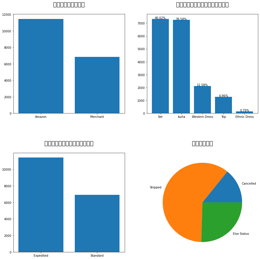 1 import pandas as pd 2 import matplotlib.pyplot as plt 3 4 # 将 CSV 文件读入pandas数据帧 5 df = pd.read_csv('C:\\Users\\Lenovo\\Desktop\\python\\Amazon Sale Report.csv') 6 7 # 筛选数据框以仅包括已发货和已取消的销售 8 filtered_df = df[df['Status'].isin(['Shipped', 'Cancelled'])] 9 10 # 按状态对筛选的数据框进行分组并计算计数 11 by_status = filtered_df.groupby('Status').count()['SKU'] 12 13 # 创建一个名为“分组状态”的新列,以将所有其他状态类型分组到 “其他状态” 14 df['Grouped Status'] = df['Status'].apply(lambda x: x if x in ['Shipped', 'Cancelled'] else 'Else Status') 15 16 # 按新的“分组状态”列对原始数据帧进行分组并计算计数 17 by_grouped_status = df.groupby('Grouped Status').count()['SKU'] 18 19 # 创建包含 2 行和 2 列的图形 20 fig, axs = plt.subplots(2, 2, figsize=(15, 15)) 21 22 # 创建条形图以按配送方式显示已取消的销售 23 cancelled_df = filtered_df[filtered_df['Status'] == 'Cancelled'] 24 by_fulfilment = cancelled_df.groupby('Fulfilment').count()['SKU'] 25 axs[0, 0].bar(by_fulfilment.index, by_fulfilment.values) 26 axs[0, 0].set_title('按履行方式取消销售',fontsize=20, x=0.5, y=1.05, pad=10) 27 28 # 按产品类别对取消的销售额进行分组并计算计数 29 by_category = cancelled_df.groupby('Category').count()['SKU'] 30 31 # 按已取消销售的计数对类别进行排序 32 by_category = by_category.sort_values(ascending=False) 33 34 # 保留前 5 个类别 35 top_category = by_category[:5] 36 37 # 计算每个顶级类别的取消销售百分比 38 category_percentages = (top_category / cancelled_df.shape[0]) * 100 39 40 # 创建条形图以按前 5 个产品类别显示已取消的销售额 41 axs[0, 1].bar(top_category.index, top_category.values) 42 axs[0, 1].set_title('按产品类别划分的取消销售前五名',fontsize=20, x=0.5, y=1.05, pad=10) 43 44 # 将百分比标签添加到条形图 45 for i, v in enumerate(top_category.values): 46 axs[0, 1].text(i, v+5, f'{category_percentages.values[i]:.2f}%', ha='center') 47 48 49 50 # 创建条形图以按配送服务级别显示已取消的销售 51 by_shipping = cancelled_df.groupby('ship-service-level').count()['SKU'] 52 axs[1, 0].bar(by_shipping.index, by_shipping.values) 53 axs[1, 0].set_title('按运输服务水平划分的取消销售',fontsize=20, x=0.5, y=1.05, pad=10) 54 55 # 创建饼图以显示销售的总体状态 56 by_status = filtered_df.groupby('Status').count()['SKU'] 57 by_status['Else Status'] = df.groupby('Grouped Status').count()['SKU']['Else Status'] 58 axs[1, 1].pie(by_status.values, labels=by_status.index) 59 axs[1, 1].set_title('整体销售情况',fontsize=20, x=0.5, y=1.05, pad=10) 60 61 # 调整子图之间的间距 62 plt.subplots_adjust(hspace=0.4) 63 64 # 显示图表 65 plt.show()