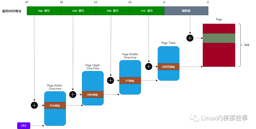 CR3寄存器中获取页全局目录的物理内存地址,然后以虚拟内存地址的 39 ~ 47 位作为索引,从页全局目录中读取到页上级目录的物理内存地址。 -