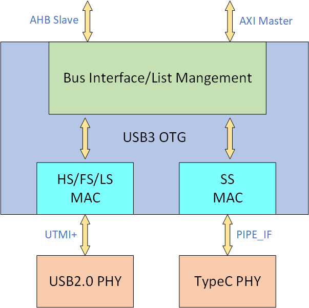 从下面的硬件框图中可以看出,USB3.0 OTG控制器内部的USB2.0和USB3.0的PHY和MAC是独立的,各自使用自己的硬件。因此USB2.0和USB3.0的带宽也是独立计算的,USB2.0的带宽并不会占用USB3.0的带宽。USB3.0 OTG控制器由以下几部分组成: