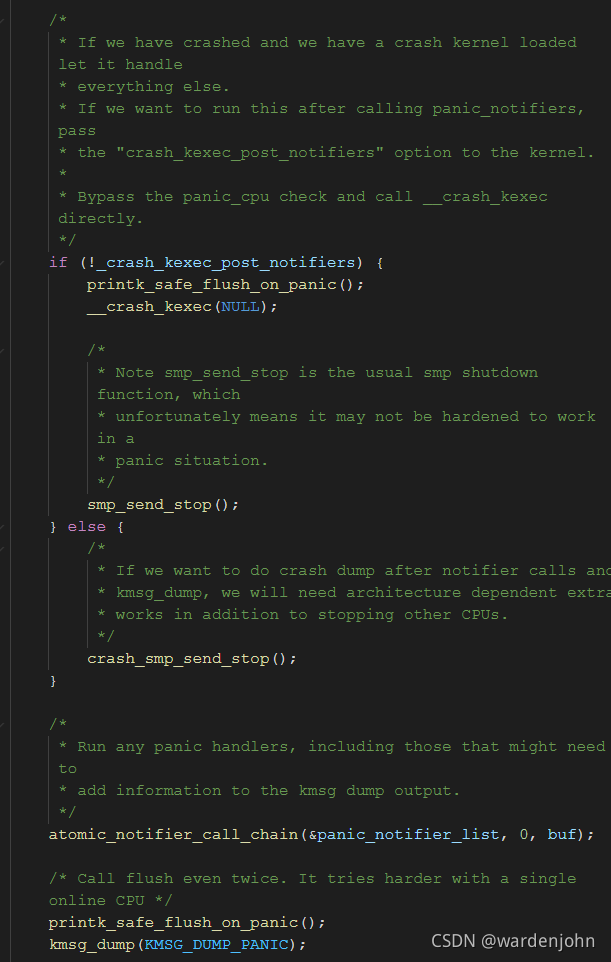 当系统崩溃的时候,系统会调用panic函数,在这里完成到crash kernel的跳转操作。