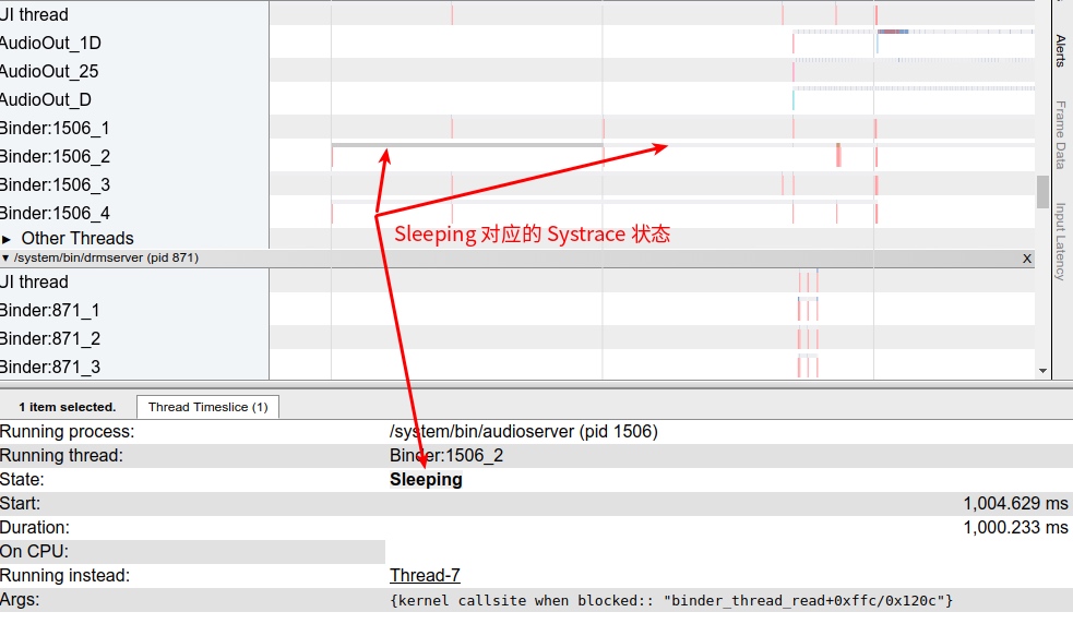Systrace 可以标示出这个的一个原因是,一个任务在进入 Running 状态之前,会先进入 Runnable 状态进行等待,而 Systrace 会把这个状态也标示在 Systrace 上(非常短,需要放大进行看)