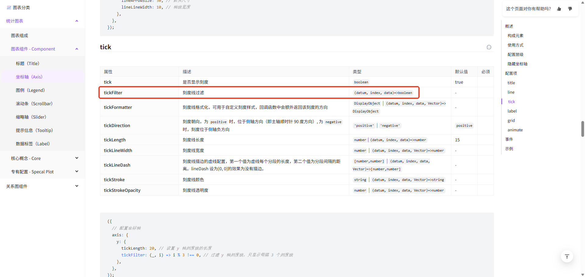 const config: ColumnConfig = { ... axis: { y: { tickFilter: (datum: number) => { return Number.isInteger(datum) }, // 过滤 y 轴刻度线,只显示整数刻度线 }, }, ... }