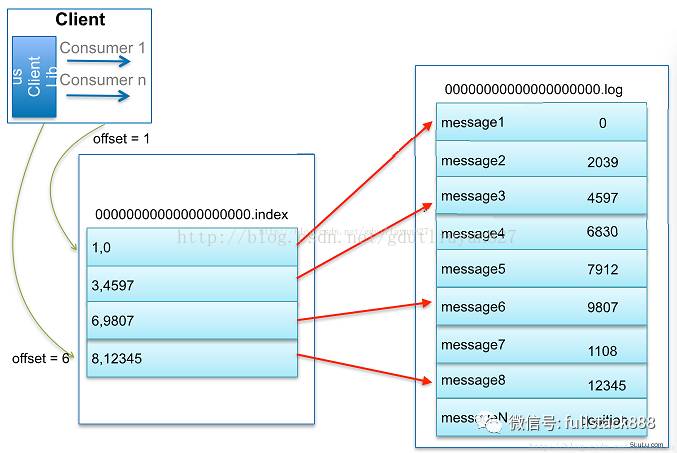 下面我们来思考另一个问题,如果一个Parition只有一个数据文件会怎么样? 新消息是添加在文件末尾,不论文件数据文件有多大,这个操作永远都是O(1)。但是在读取的时候根据offset查找Message是顺序查找的,因此,如果数据文件很大的话,查找的效率就低。那么Kafka是如何解决查找效率的的问题呢?1) 分段、2) 索引。