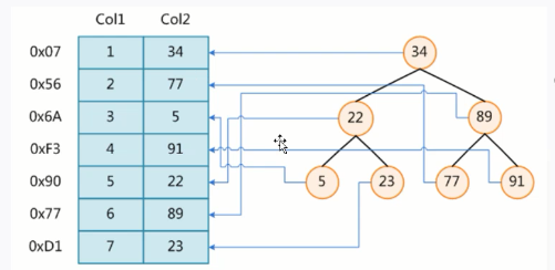 为了加快数据的查找,可以维护二叉查找树, 每个节点分别包含索引键值和一个指向对应数据记录的物理地址的指针,这样就可以运用二叉查找在一定的复杂度内获取相应的数据,从而快速的检索出符合条件 的记录