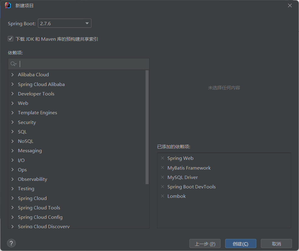 2.点击下一步 springbooot选择2.7.6 -->搜索并添加以下依赖: Spring Web 、MyBatis Framework 、MySQL Driver 、Spring Boot、 DevTools Lombok