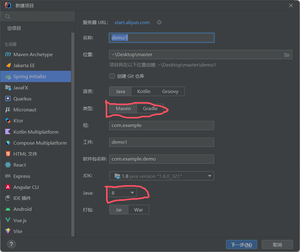 1.打开IDEA -->新建项目-->选择spring initializr --> 命名为demo1-->选择maven--> java 8