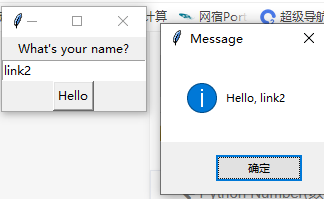 1 from tkinter import * 2 import tkinter.messagebox as messagebox 3 4 class Application(Frame): 5 def __init__(self, master=None): 6 Frame.__init__(self, master) 7 self.pack() 8 self.createWidgets() 9 10 11 def createWidgets(self): 12 self.namelabel=Label(self,text="What's your name?") 13 self.namelabel.pack() 14 self.nameInput = Entry(self) 15 self.nameInput.pack() 16 self.alertButton = Button(self, text='Hello', command=self.hello) 17 self.alertButton.pack() 18 19 def hello(self): 20 name = self.nameInput.get() or 'world' 21 messagebox.showinfo('Message', 'Hello, {}'.format(name)) 22 23 app = Application() 24 # 设置窗口标题: 25 app.master.title('Hello World') 26 # print(app.master.size) 27 # 主消息循环: 28 app.mainloop()
