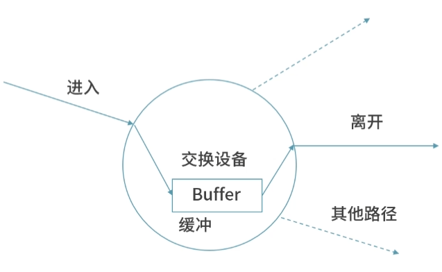 公司网络从本地网络服务提供商 (Internet Service Provider) 接入,然后内部再分成一个个子网。上图中看到的线路,也被称作通信链路(Communication Link),用于传输网络信号。你可以观察到,有的网络节点,同时接入了 2 条以上的链路,这个时候因为路径发生了分叉,数据传输到这些节点需要选择方向,因此我们在这些节点需要进行交换(Switch)。数据发生交换的时候,会先从一条链路进入交换设备,然后缓存下来,再转发(切换)到另一条路径,如下图所示: