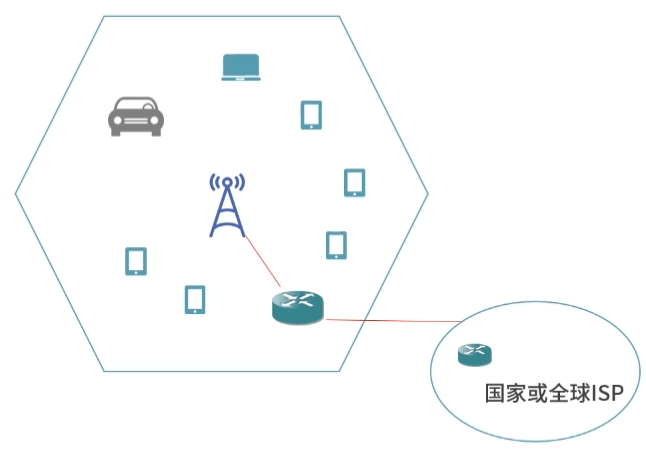 国家或全球网络提供商将网络供给处于蜂窝网络边缘的路由器,路由器连接蜂窝塔,再通过蜂窝塔(基站)提供给处于六边形地区中的设备。通常是国家级别的网络服务提供商负责部署基站,比如中国电信、中国联通。将网络提供给一个子网的行为,通常称为网络提供(Network Provider),反过来,对一个子网连接提供商的网络,称为网络接入(Network Access)。