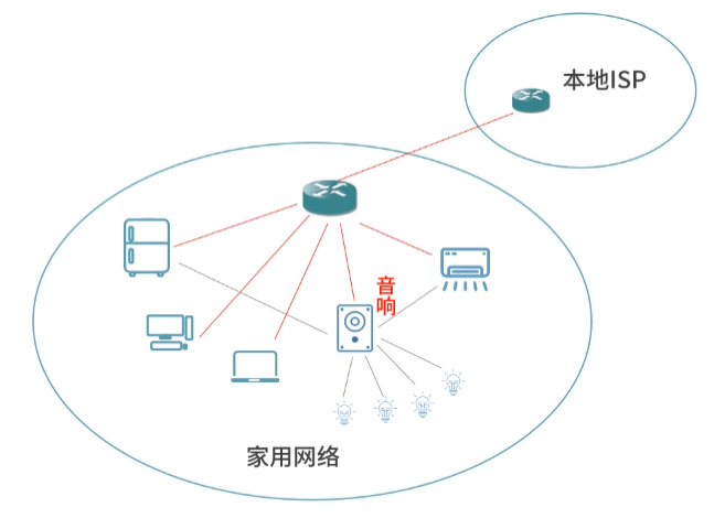 家用网络现在已经发展成一种网格状的连接。一方面家用网络会通过路由器接入本地 ISP 提供的网络服务。另一方面,一些设备,比如电脑、笔记本、手机、冰箱等都可以直接和路由器连接。路由器也承担了链路层网关的作用,作为家用电器之间信息的交换设备。