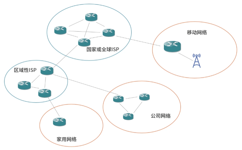 最顶部的全球或国家大型的 ISP 之间联网,构成了网络的主干。然后区域性的 ISP 承接主干网络,在这个基础之上再向家庭和公司提供接入服务。移动蜂窝网络因为部署复杂,往往也是由大型 ISP 直接提供。